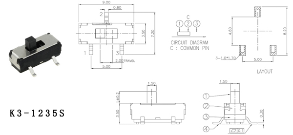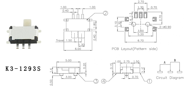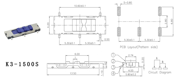 K3-1500S貼片撥動開關(guān)電路接線圖: